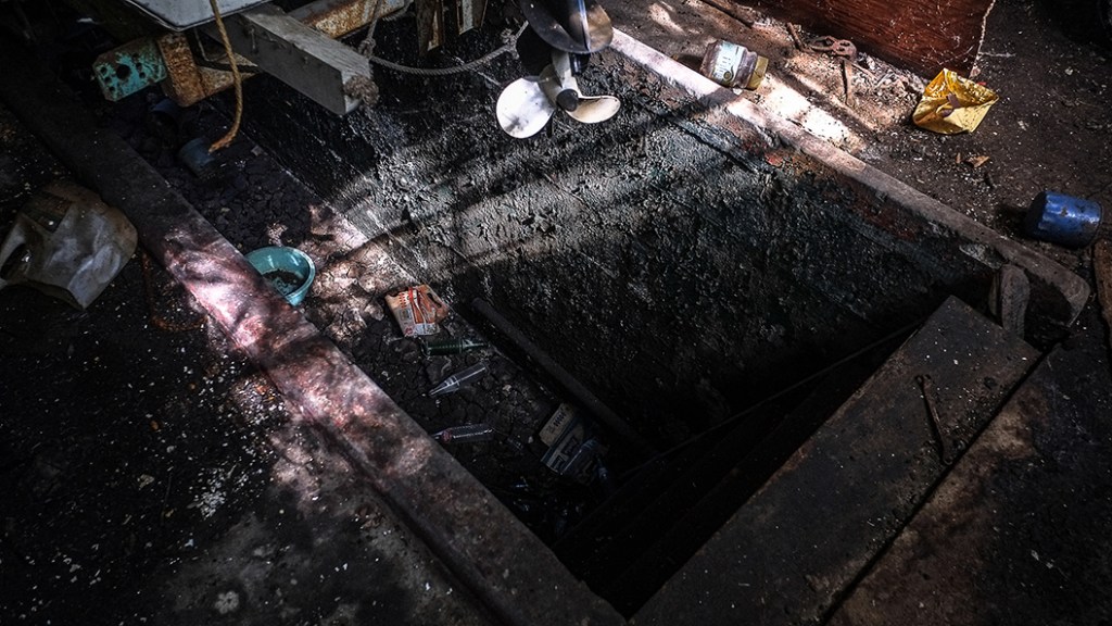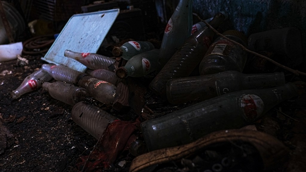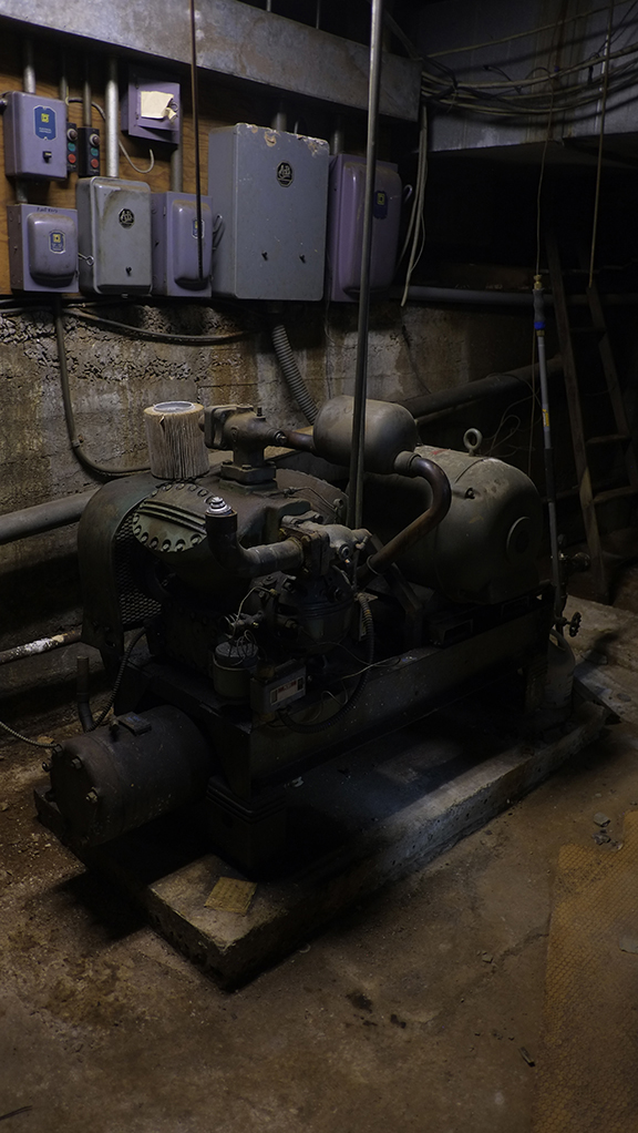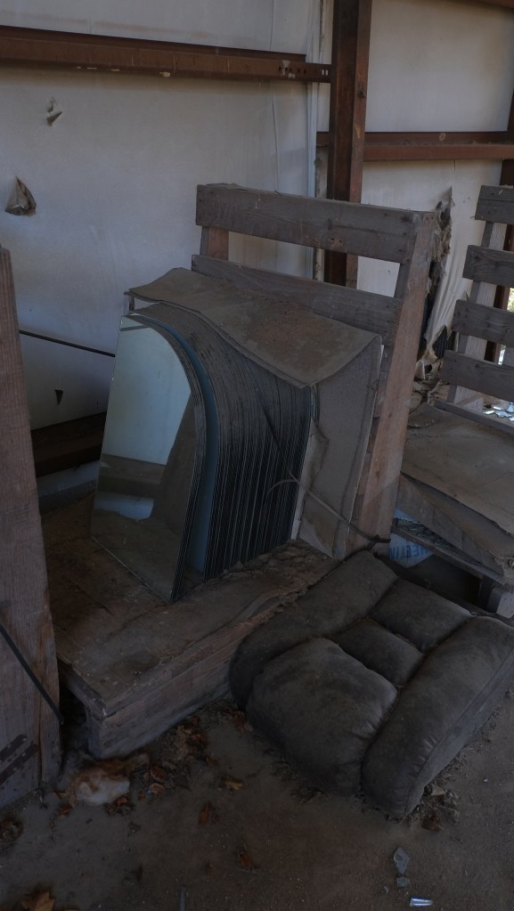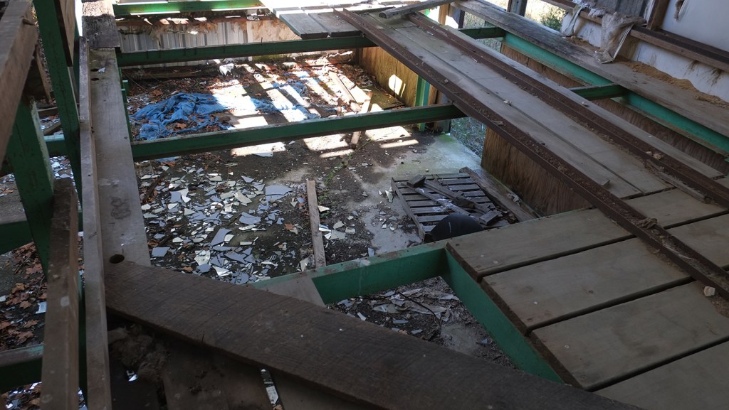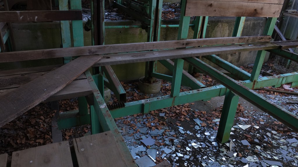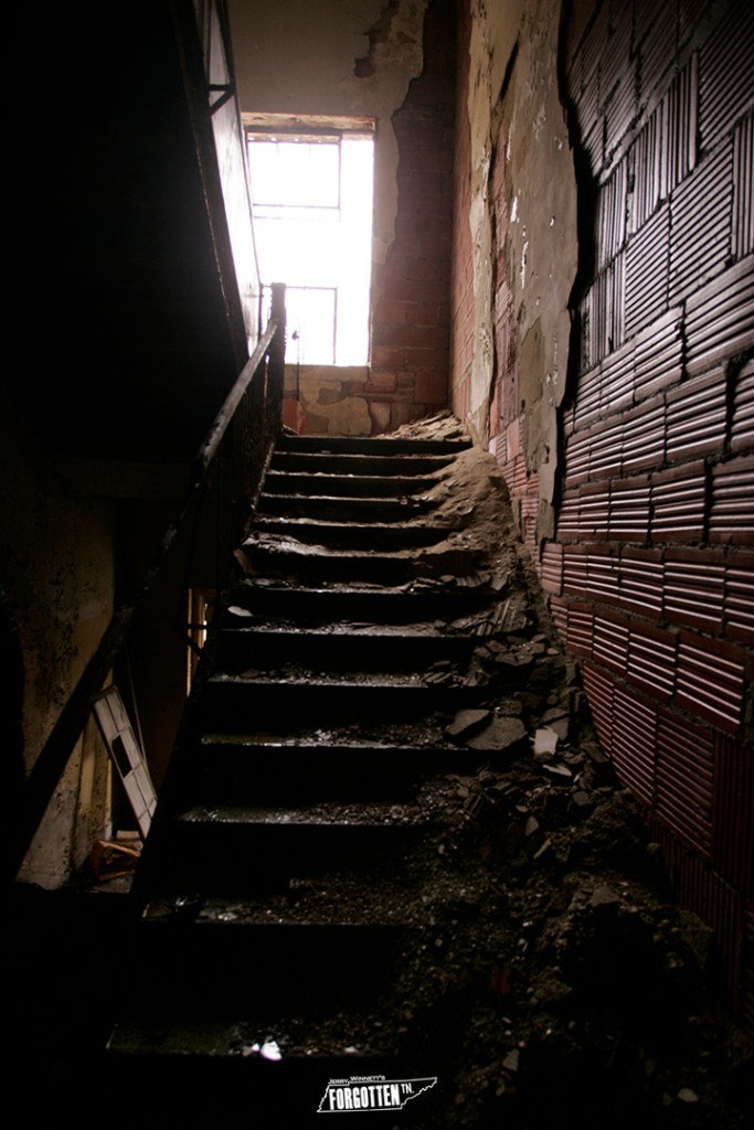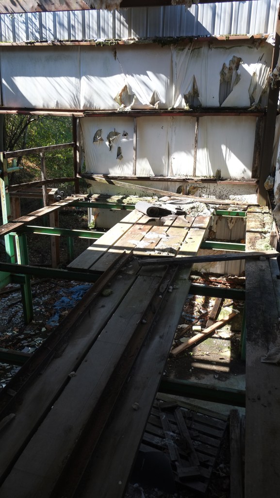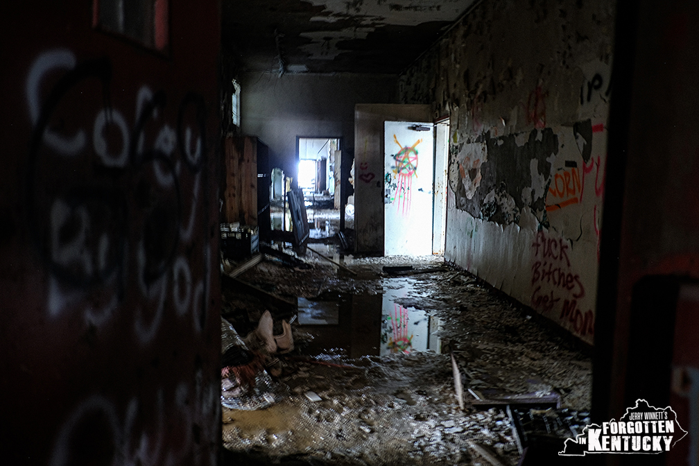 From there I eagerly went to the next building, a newer looking addition than the one I’d just left. Up the stairs and in I went. This was more than creepy. Lighting as before was sparse, and cast the lower half of the landing I stood on in shadows. I decided to go up and see what there was to see. Up a short flight of steps I went and stood for a second looking at a recliner. Yes, a recliner in a hall next to a bathroom and a sink. Further down all I could see was a darkened hallway and a window where light came in through broken glass on the upper from doors. The floor before me was a nasty mix of “squish and crunch”, its a texture you’d have to experience first hand to fully appreciate it’s grossness. And while it can be disturbing to tread upon, I’m a pro. I only slightly grimaced.
