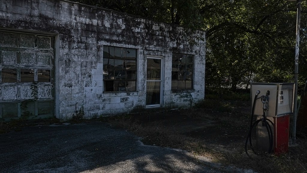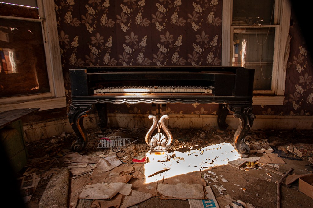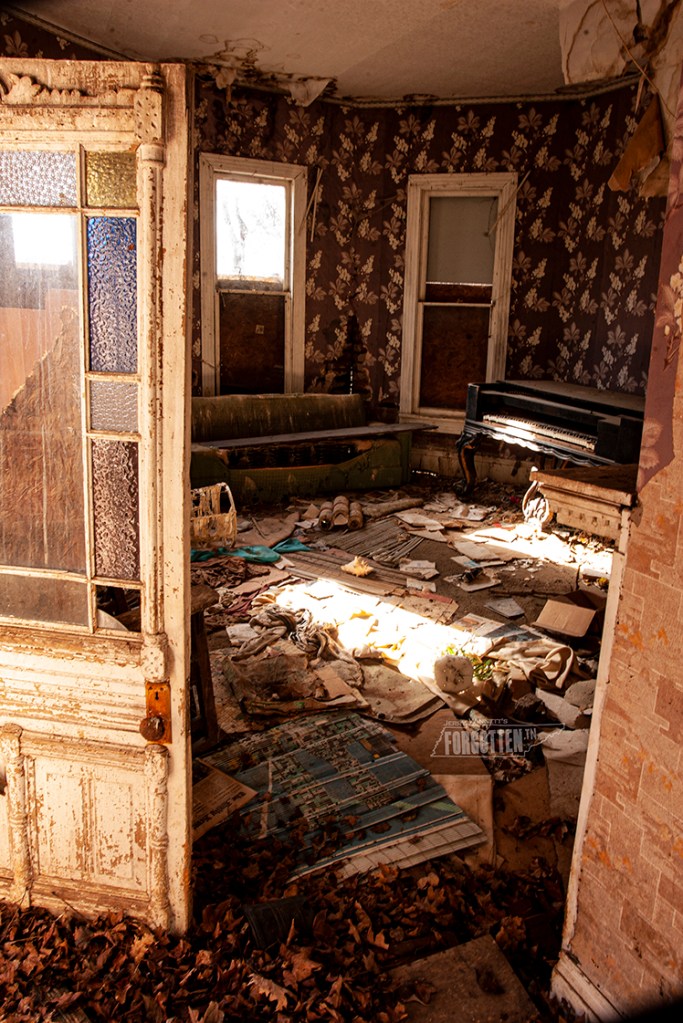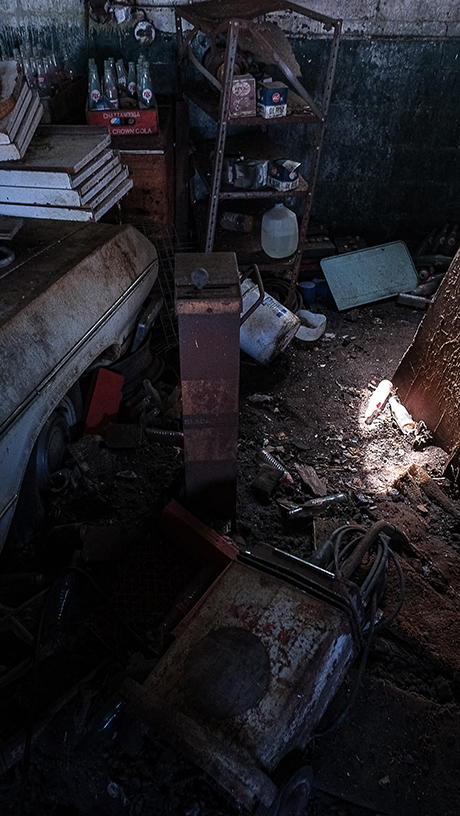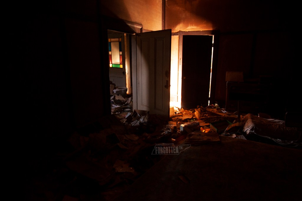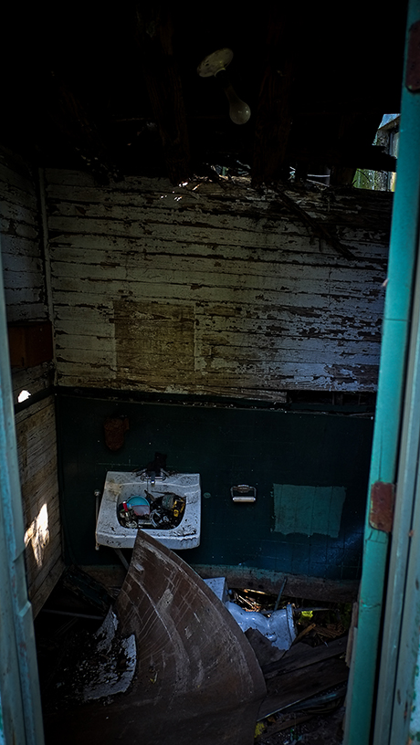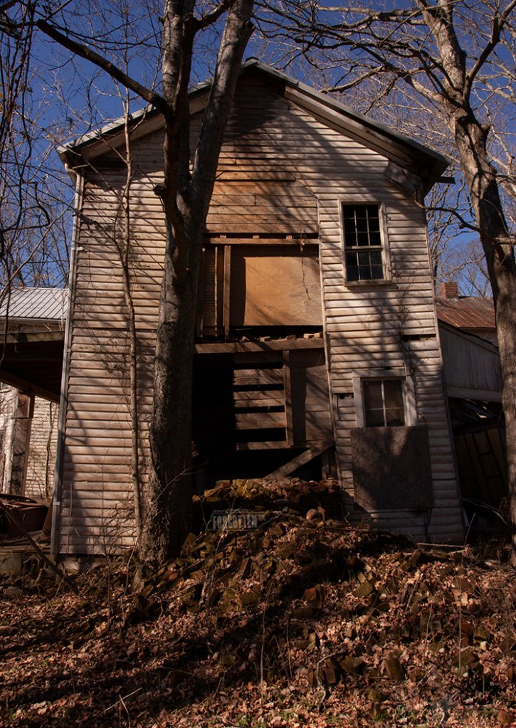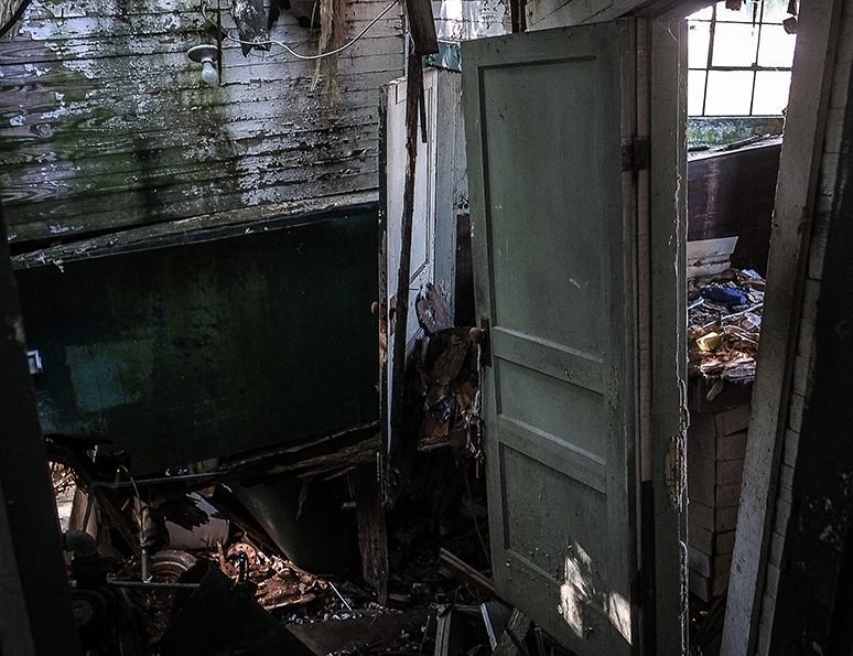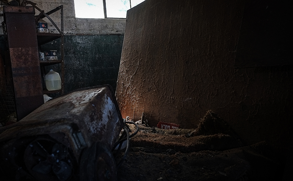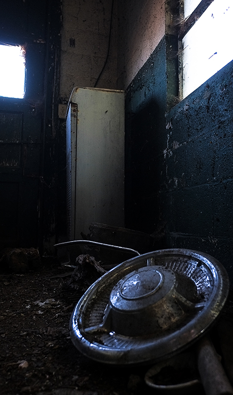 “Grossly slick” is the best way to describe the rotted debris I walked upon while I shot, trying my best to capture the moment for your eyes. Charred timbers lay here and there, streak and bubbled paint covered surfaces. Burnt hair, that was the only thing I could compare the odor of this place. I was nearly done. Perhaps I’d shot some more. Maybe I’d worked up the nerve to try my luck with the rotted floor of the large room to my right. But a reflection caught my eye. Walking back to the doors I ‘d entered I could see a Sheriff’s car parked behind my own car, and a deputy peering into the back windows. This was my cue that it was time to go.