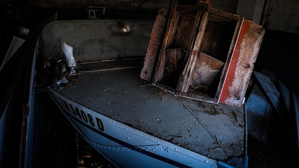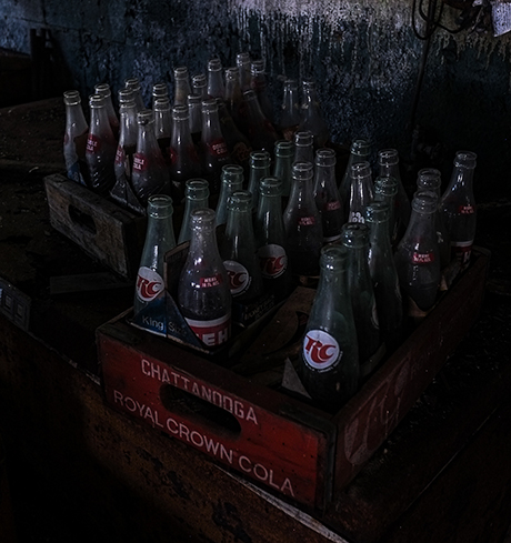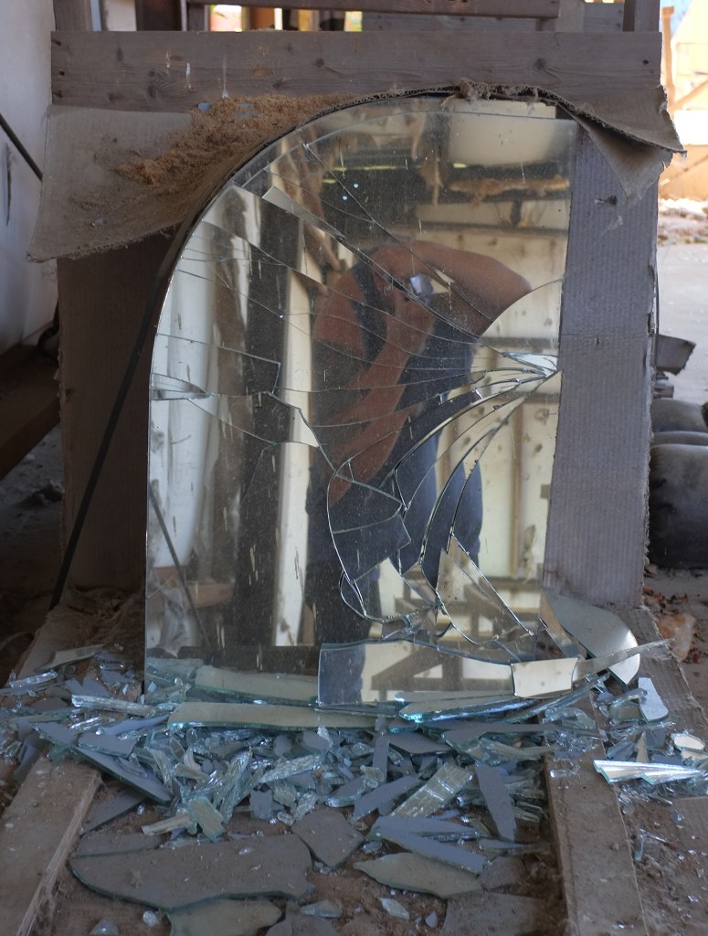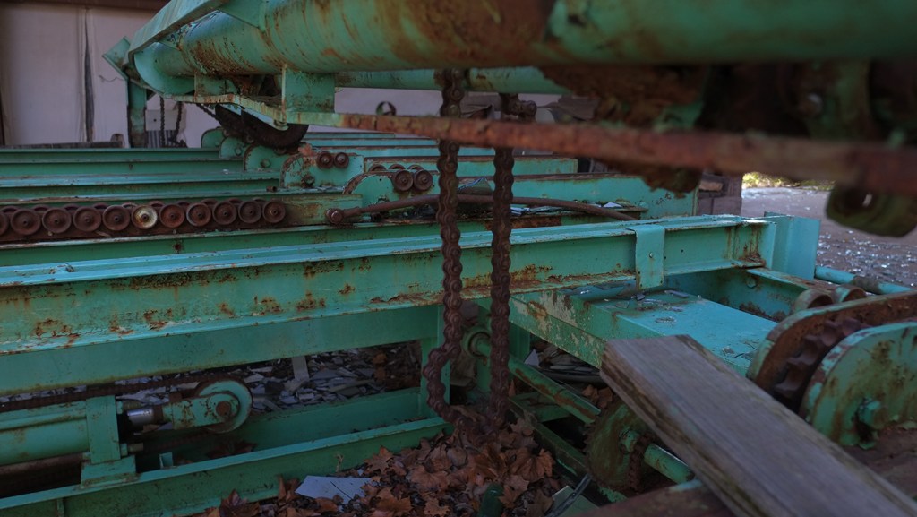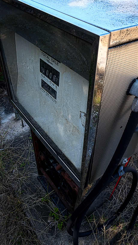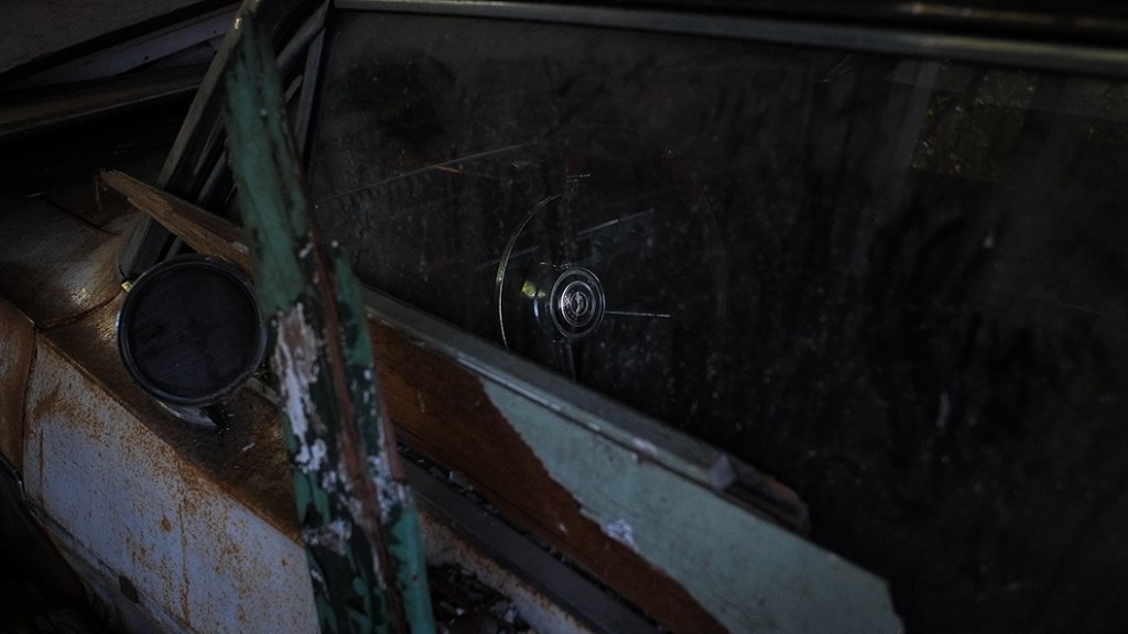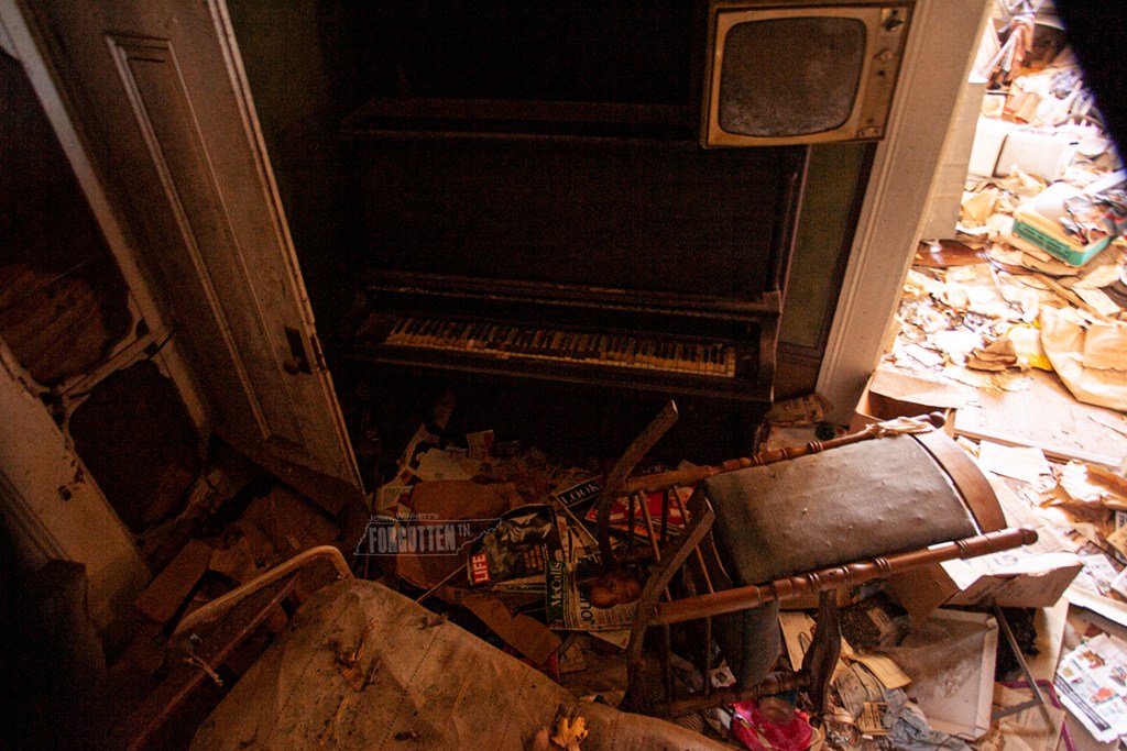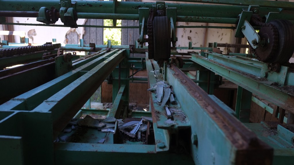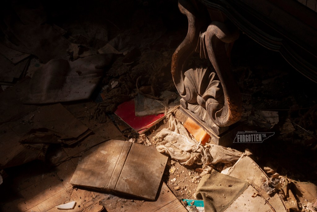 “Grossly slick” is the best way to describe the rotted debris I walked upon while I shot, trying my best to capture the moment for your eyes. Charred timbers lay here and there, streak and bubbled paint covered surfaces. Burnt hair, that was the only thing I could compare the odor of this place. I was nearly done. Perhaps I’d shot some more. Maybe I’d worked up the nerve to try my luck with the rotted floor of the large room to my right. But a reflection caught my eye. Walking back to the doors I ‘d entered I could see a Sheriff’s car parked behind my own car, and a deputy peering into the back windows. This was my cue that it was time to go.