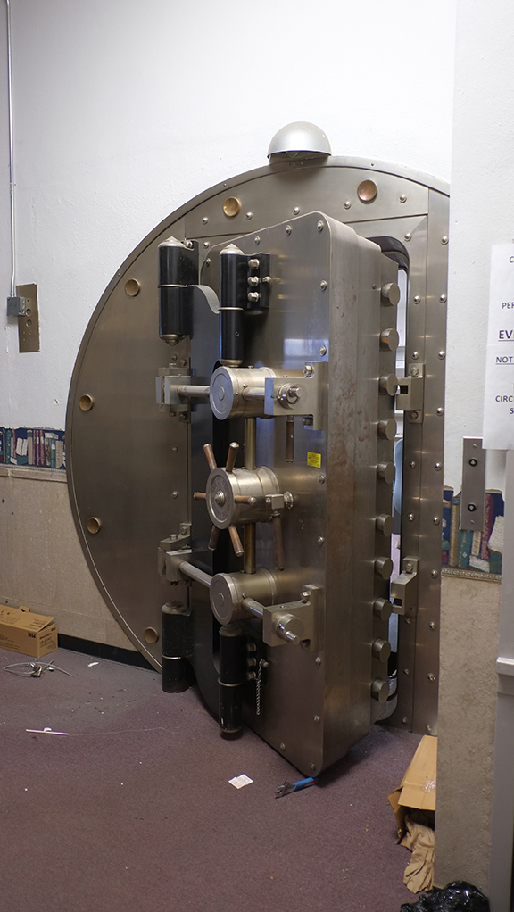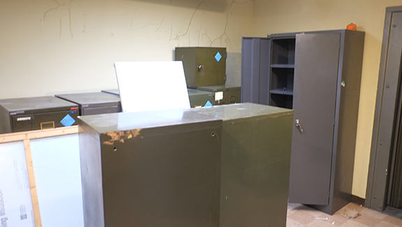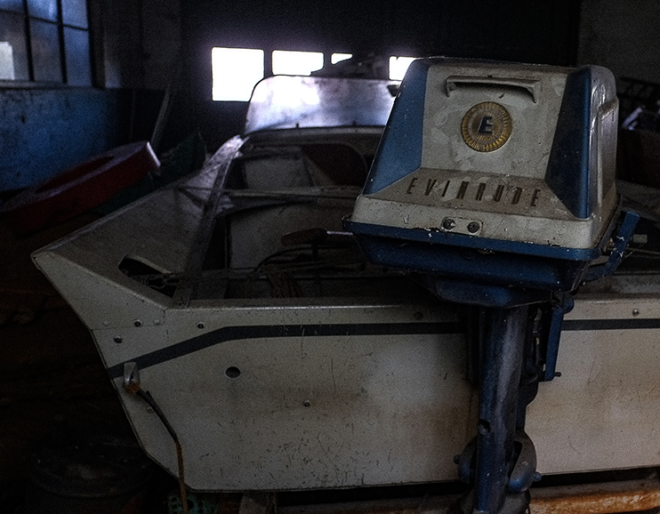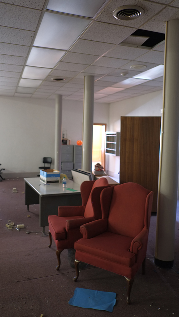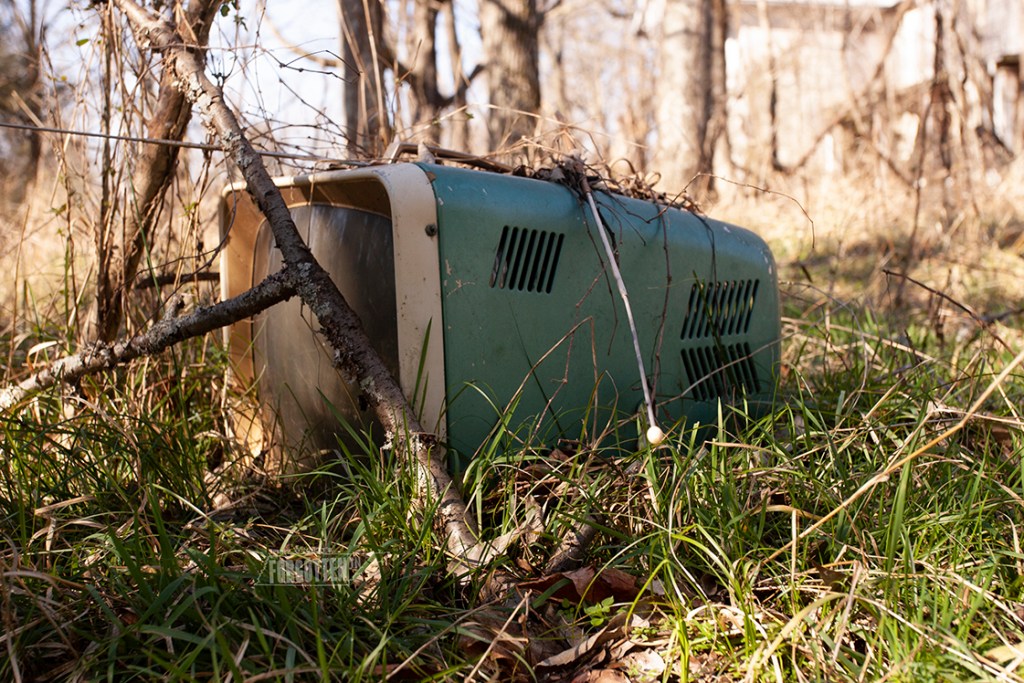 “AAAAAAAAAAH SHIT” I exclaimed in a loud hiss! Hands windmilling in an effort to keep upright. As I just mentioned the hallway was dark. It was also cluttered and someone decided to put a moveable toilet seat in the middle of the hall. This kind of mishap is common in exploring the abandoned. I took a quick shot of the toilet and whispered thanks to the universe I’d not stepped in shit, or fallen on my ass. To The rest of the hall was littered with assorted pots, pans, and molds. I was standing in a wedge of light that led into what I took to be the Home Economics room. I passed on this room, it was pretty much empty, and went to the opposite room instead. This one was also empty but it had that “lived in look”. This wasn’t too surprising. I was getting the feeling that at some point someone had actually lived in this wing of the school. Honestly the large, wood encased, TV console along with the recliner I’d found were dead giveaways. Also, I’d come across another room that had several recliners and a sofa. I’d not be surprised to at some point find a bed.