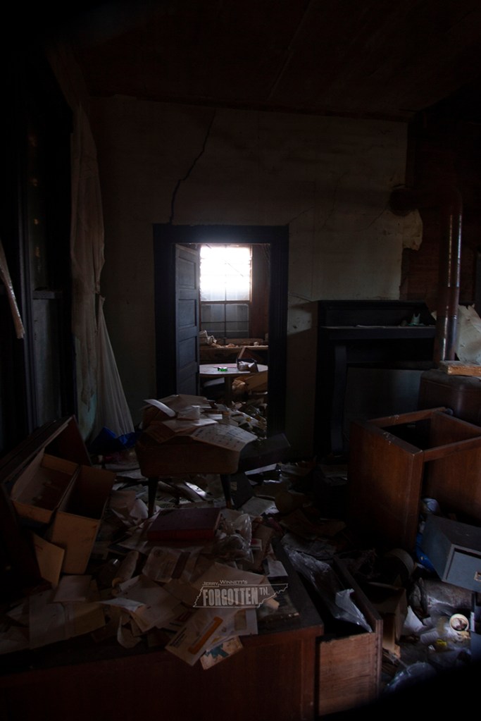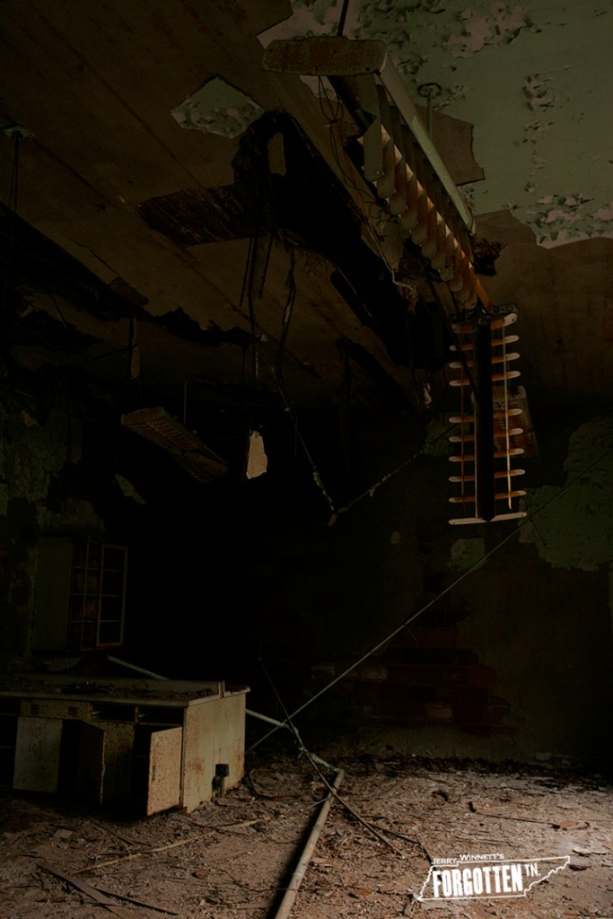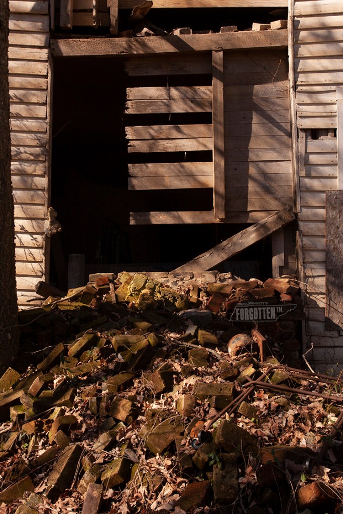 Between the two buildings was a corridor that was overgrown with weeds and small saplings. Broken windows, and giant splinters of the roof beckoned me to come closer. “Shit”! Ouch! Crap” I forgot that another common trait found in abandoned places are sticker bushes, and thorn bushes. They suck. Earlier this year in Johnson City an exploration came to a dead stop due to an acre or more of such bushes that covered the field. But whatever, I made my way to a window that looked in on the first story of the original school structure. I held my camera up and looked through its LCD to get see if it might be safe for me to enter. That was a resounding no. Two major red flags were immediately visible. What remained of the school’s ceiling and roof was only a strong wind from completely falling in and pancaking the upon the floor. The floor itself? Yeah, I could see large sections that had already collapsed into the basement. I shivered because I was in that basement not too long ago. I abandoned any thought of climbing in through the window and made my way back to the front of the school and then went left and into the building. Yes, I know I said I’d not go in, but upon further examination I found that the front section of the building’s floor was concrete. The rooms beyond that had wooden floors that were collapsing. Turning in a circle shooting away I decided that I’d found myself in a place that was spookier than the basement. The very real possibility of danger was palpable, the light was scarce, coupled with the burnt out ceiling gave a truly oppressive atmosphere. Its at times like this that I remember why its a good idea to explore such places with a buddy.