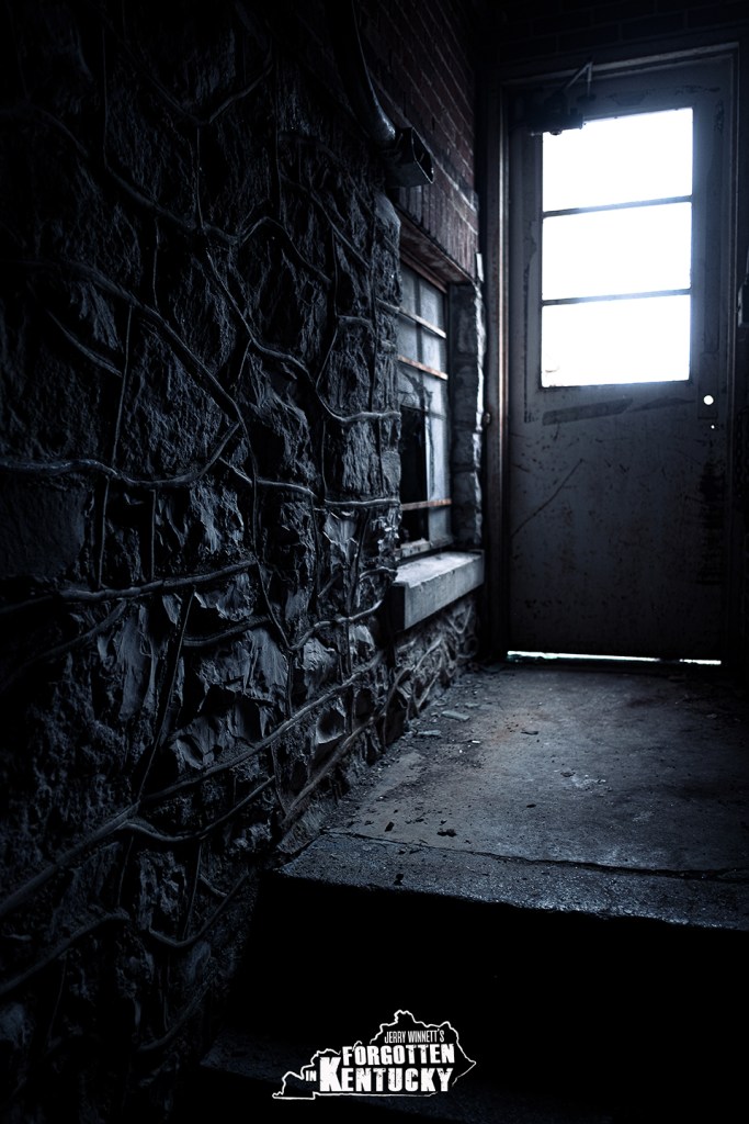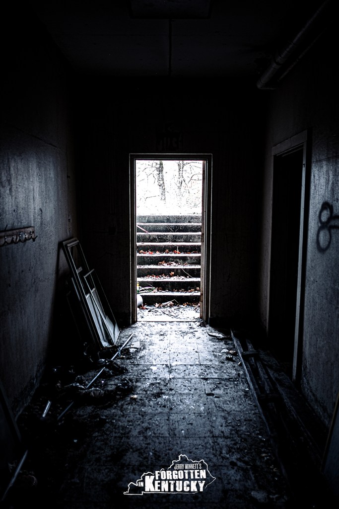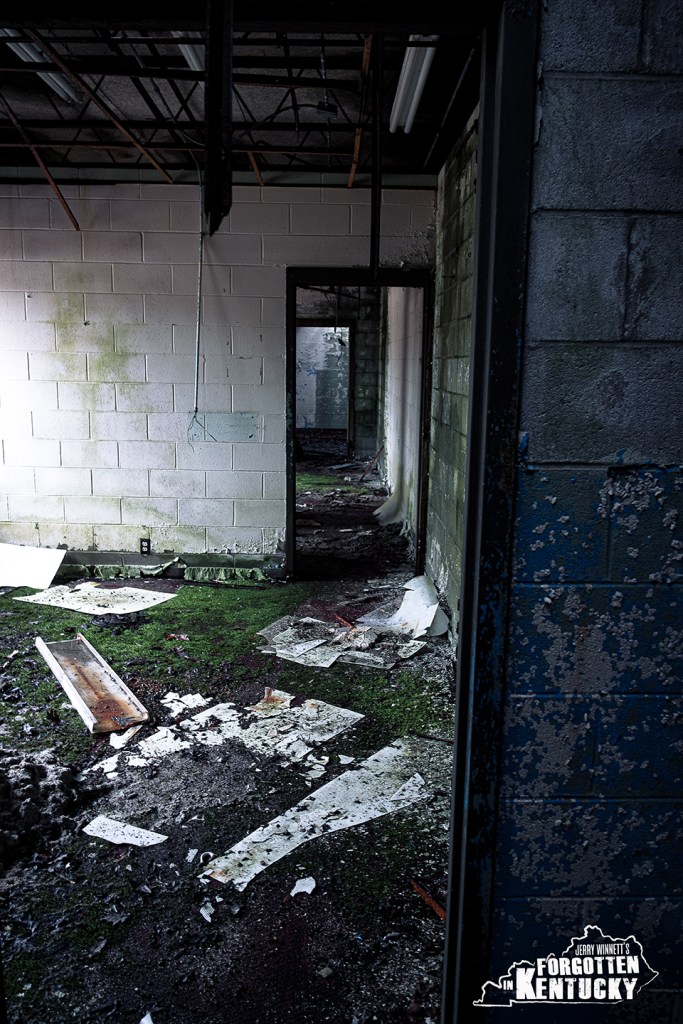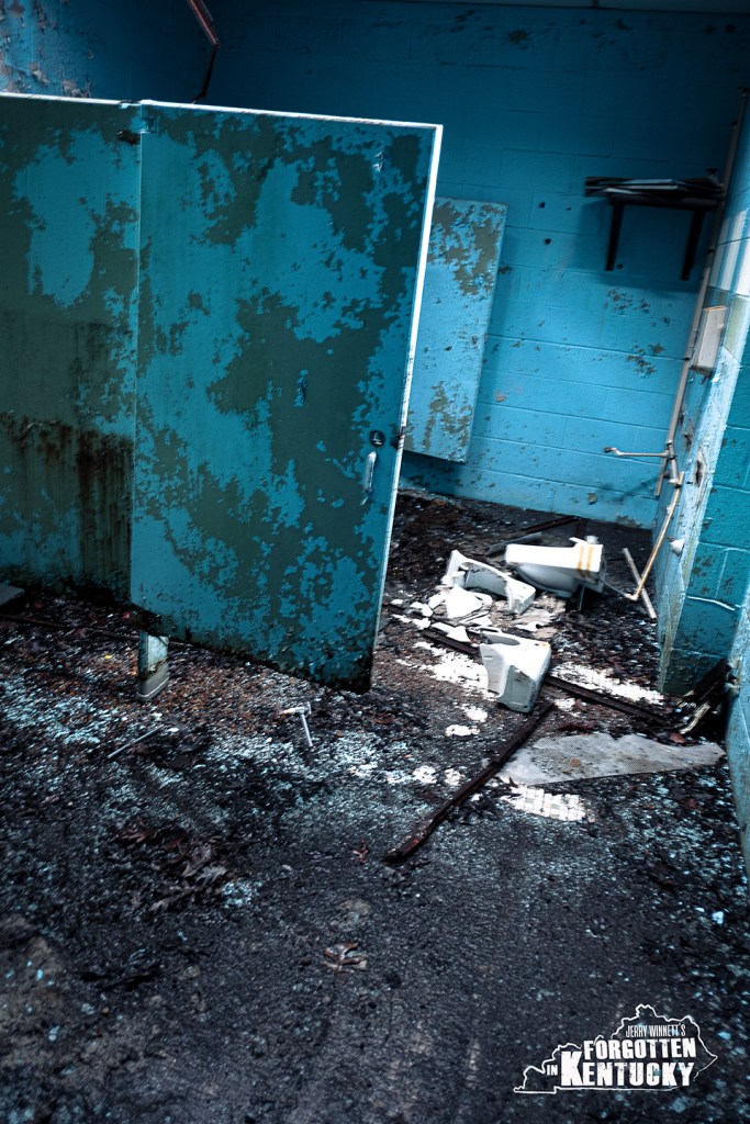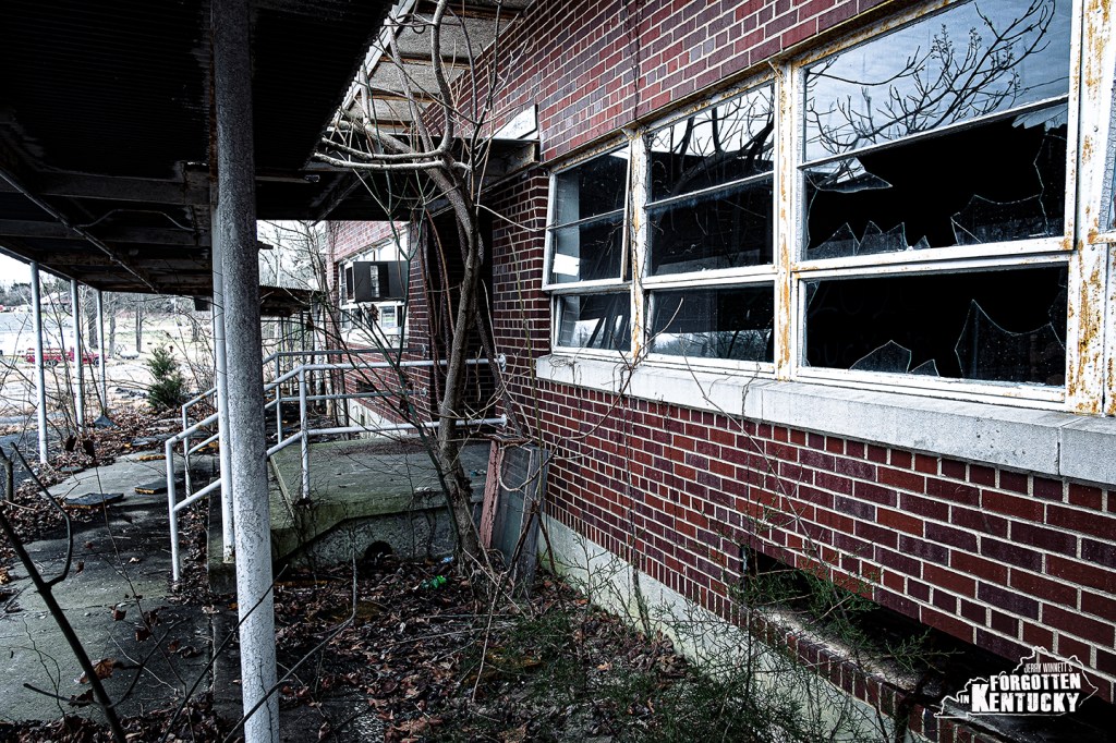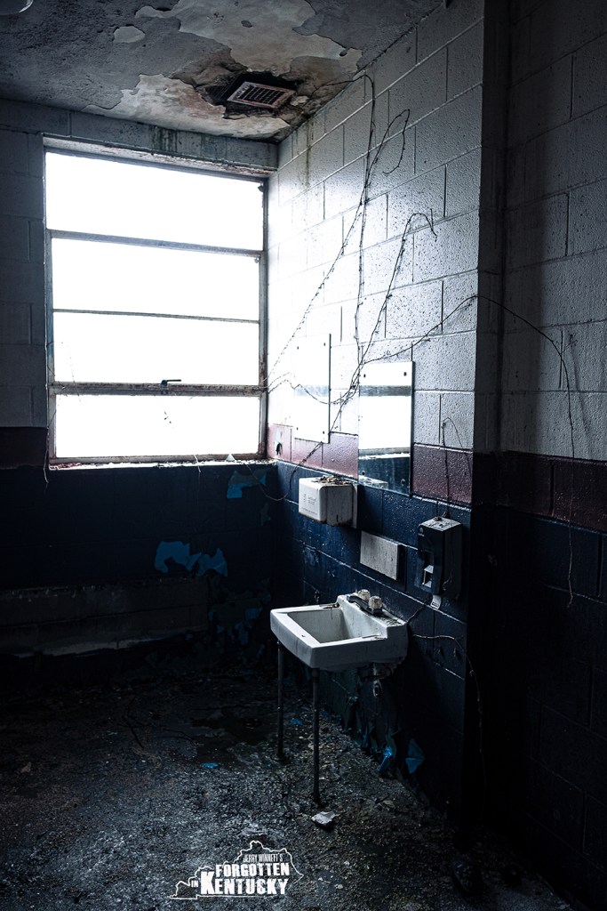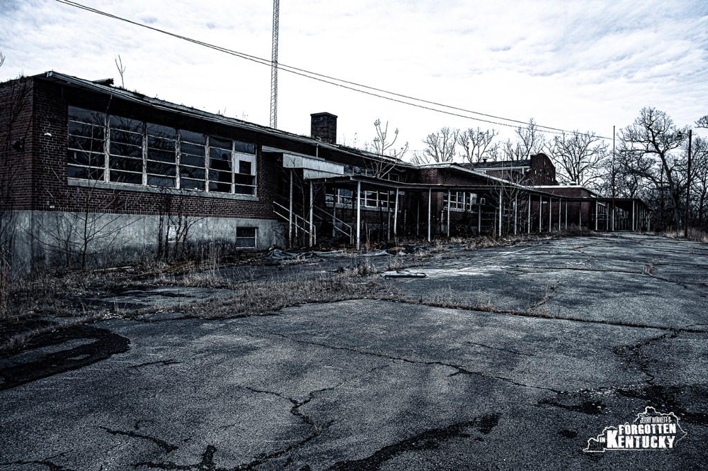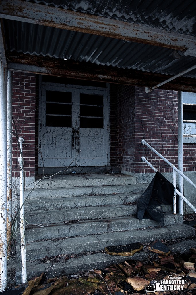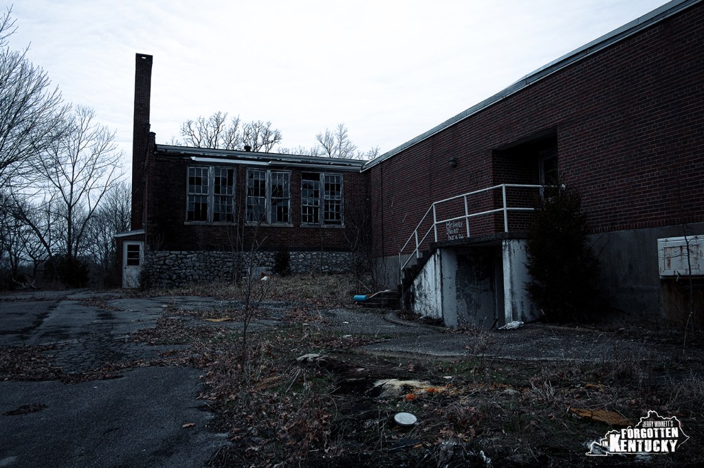 I awoke one Saturday at 630 am. I was bored and didn’t want to watch anything on Hulu or Netflix. So I grabbed my trusty camera, and camera bag, gassed up the Jerry-mobile and headed up into Kentucky. I was on a quest to find an abandoned school in Kentucky near Franklin, KY. Coffee in hand, Stephen King’s Later playing and the miles were being steadily being consumed under the car. How hard would it be to find the aforementioned school? No idea! If nothing else my trip would be enjoyable. About 2 hours later I found myself cruising thru Franklin. Franklin is a small town, pleasant enough. I could see an abandoned high-school, it was tempting but it wasn’t not what I was after I took a left out of town and continued on my way for another 24 mins , maybe more. As I rounded a bend in the road I spied my destination right off the road! I was elated. No fence barred my way. No signs stating “No Trespassing”, (awesome-sauce). The only drawback, there wasn’t really anywhere to hide my car. Ah well.I opened my camera bag, made sure my lil Fuji was ready to go, donned my headphones, made sure my phone was in my pocket and a lamp was strapped to the side of my bag as well. I started by getting a long shot of the school, it’s asphalt black top was cracked, pitted and had most definitely seen better days. On I walked shooting away and noting the broken windows, crumbling bricks, and what looked like a singed roof.