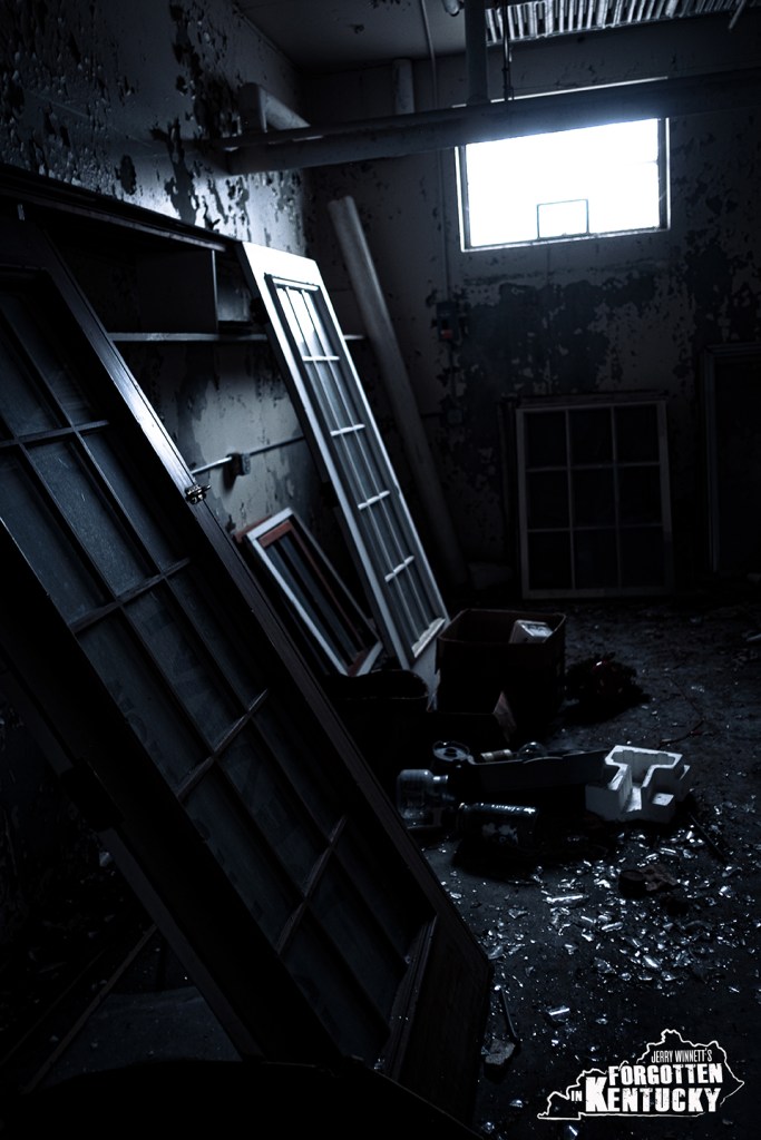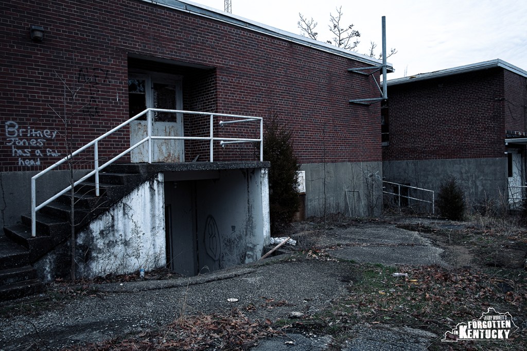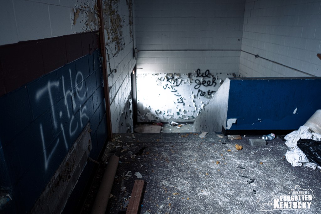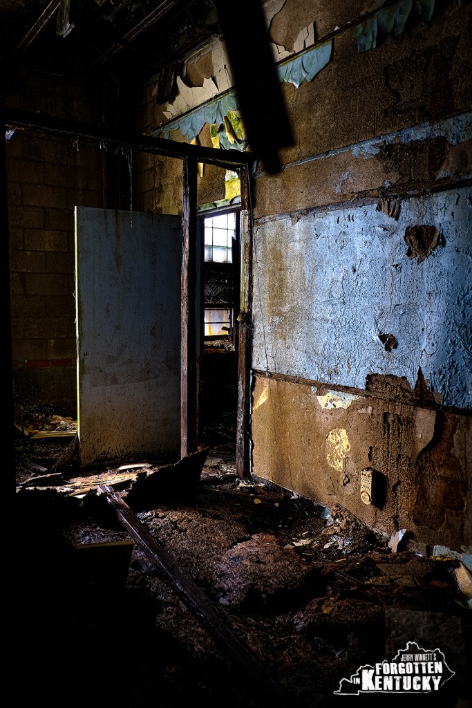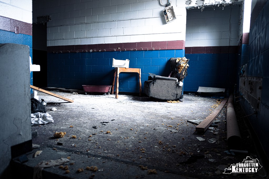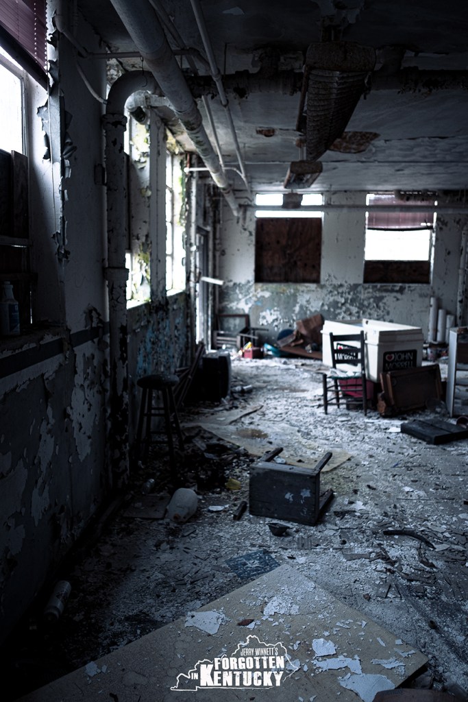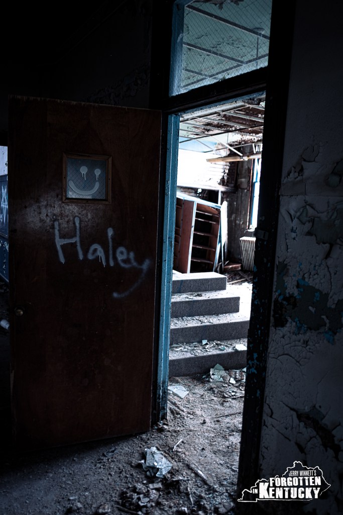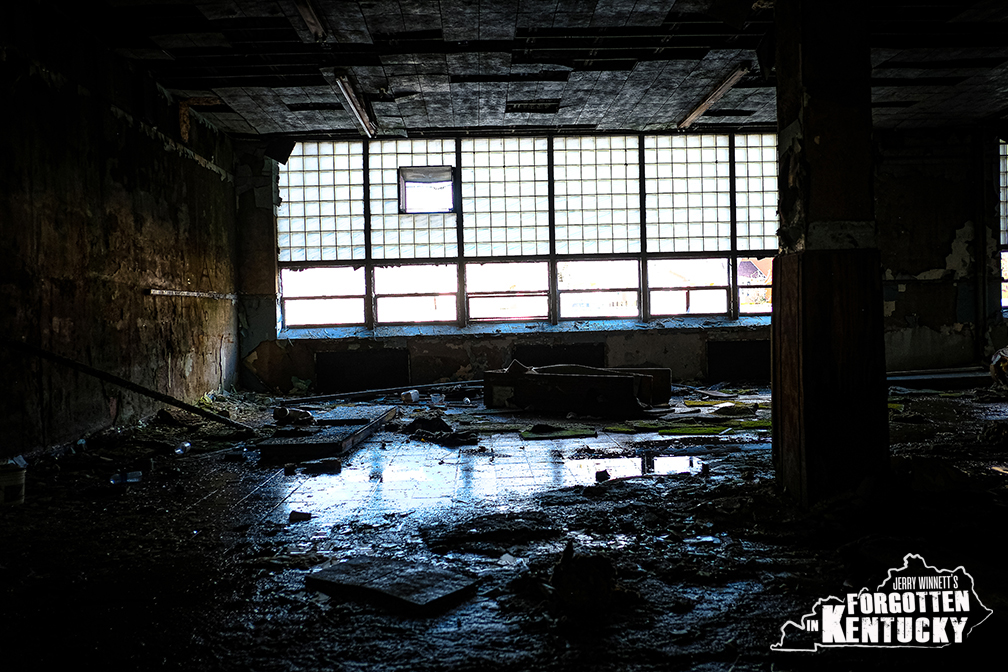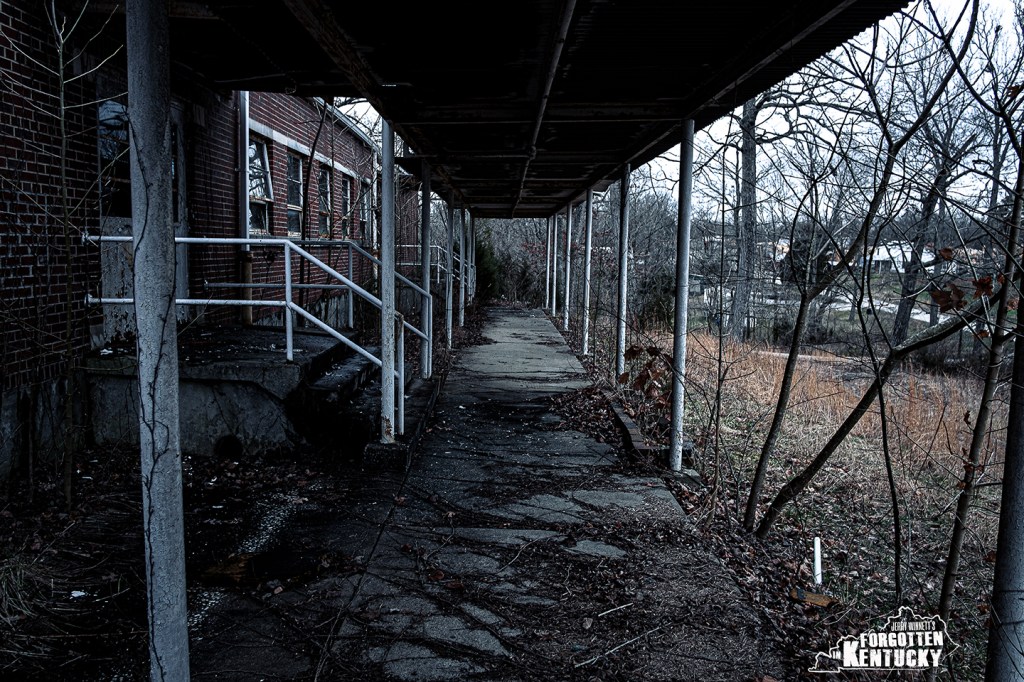 I awoke one Saturday at 630 am. I was bored and didn’t want to watch anything on Hulu or Netflix. So I grabbed my trusty camera, and camera bag, gassed up the Jerry-mobile and headed up into Kentucky. I was on a quest to find an abandoned school in Kentucky near Franklin, KY. Coffee in hand, Stephen King’s Later playing and the miles were being steadily being consumed under the car. How hard would it be to find the aforementioned school? No idea! If nothing else my trip would be enjoyable. About 2 hours later I found myself cruising thru Franklin. Franklin is a small town, pleasant enough. I could see an abandoned high-school, it was tempting but it wasn’t not what I was after I took a left out of town and continued on my way for another 24 mins , maybe more. As I rounded a bend in the road I spied my destination right off the road! I was elated. No fence barred my way. No signs stating “No Trespassing”, (awesome-sauce). The only drawback, there wasn’t really anywhere to hide my car. Ah well.I opened my camera bag, made sure my lil Fuji was ready to go, donned my headphones, made sure my phone was in my pocket and a lamp was strapped to the side of my bag as well. I started by getting a long shot of the school, it’s asphalt black top was cracked, pitted and had most definitely seen better days. On I walked shooting away and noting the broken windows, crumbling bricks, and what looked like a singed roof.
