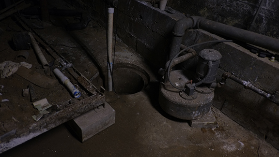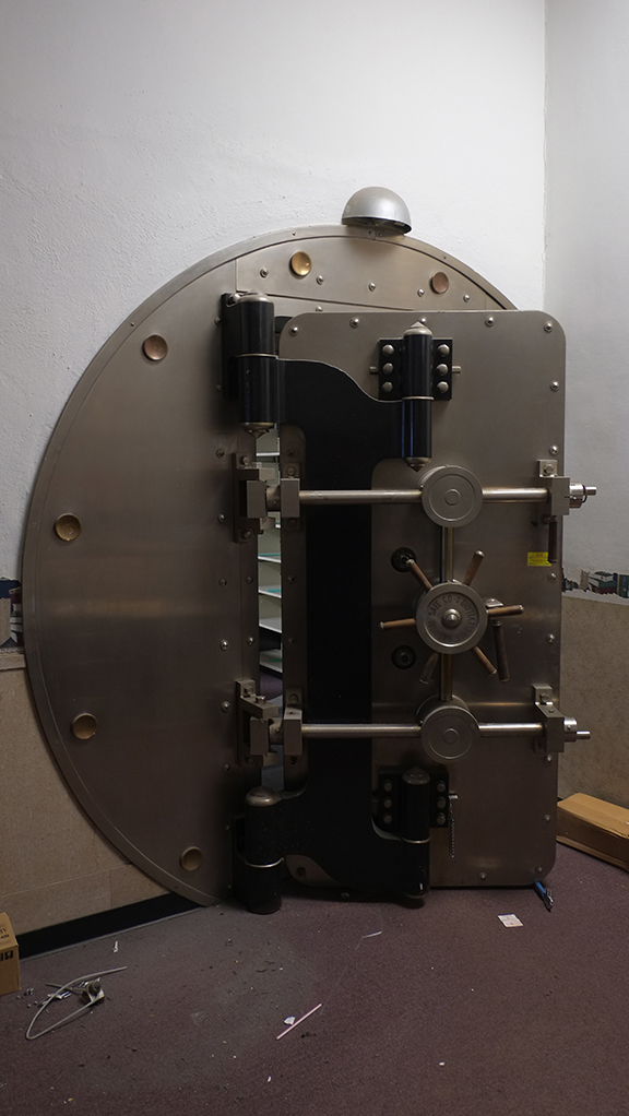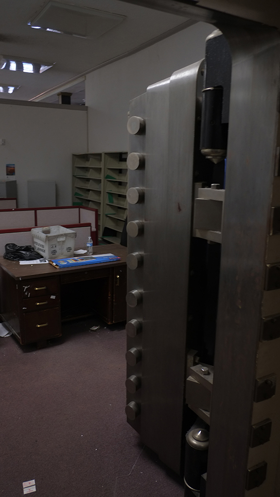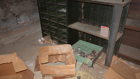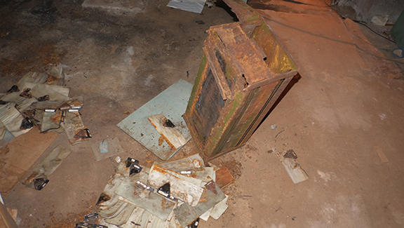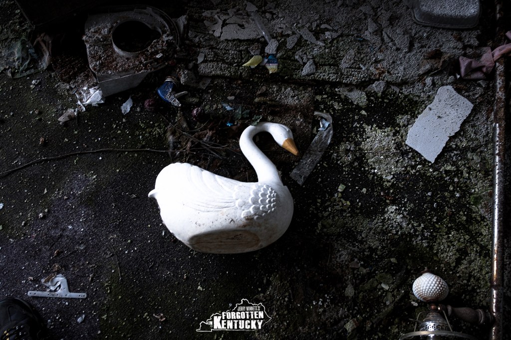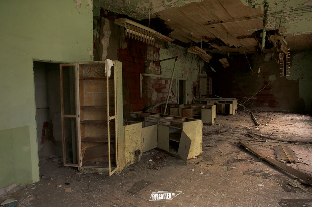 After a bit I’d decided that I’d seen all there was to see upstairs and carefully made my way back to where I cam in. Down the stairs into an area bathed in shadows, oh, no. Wait the doors were actually painted black. That didn’t help. Pushing the doors open slowly I peered around a large open space, that at some point served as a lunch room. Once again I found myself wondering about the size of the classes held here. There were piles of stuff here and there and another discarded TV. There are traits I’ve come to expect from all abandoned places, they are as follows. Badly rendered penises, and boobs, toys (sometimes adult), and discarded TV’s. Honestly, why is it so hard to get rid of TV’s? In one room I found what was left of the cafeteria’s kitchen. Dirt and mud covered nearly everything making me think this place had to have been flooded at some point. That’s a bit creepy really. Yet another room held doors. Just doors. Institutional doors meant for a building like this, but residential doors too. The light here was nearly as bad as it was in the other basement wing. I was just happy that the ceiling above was in better shape. FInally I went into a room on the far left and found a series of darkened rooms filled with a bizarre assortment of junk, in one room a mattress sat in the middle of the floor, with several plastic chairs around it. I wont hazard a guess at how much use the mattress got, but come on, an audience too? Ah well, gotta get your entertainment where you can I guess. The darkness wasn’t the worse part of this large ongoing basement. No, the floor was damp, and the smell? Yeah, the place reeked of rotting floors and carpet. Finally I came out in a hallway that led to a way out. I could not have been happier to make my way outside and breathed in the fresh air.