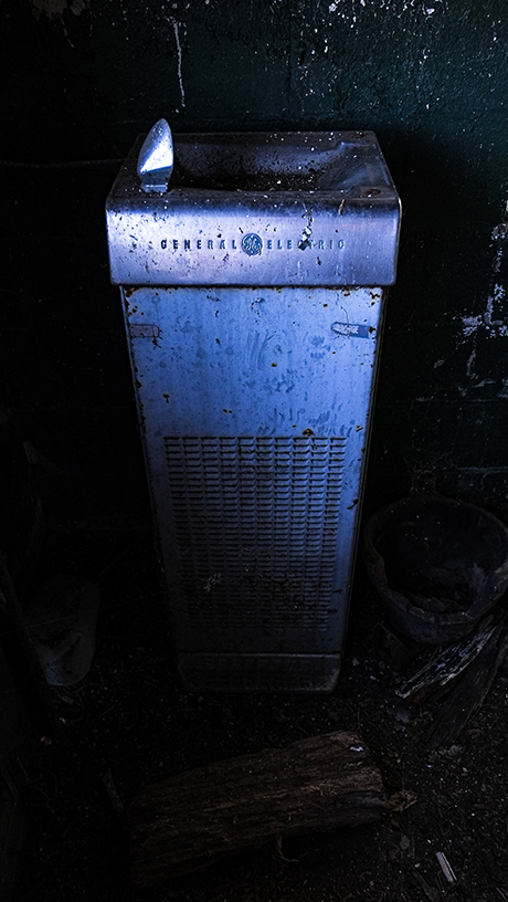 As long as the bathrooms were directly to my right that is where I started my exploration of this wing of the school. Gloom was the order of the day and it dominated the atmosphere. Right off the bat upon entering the boys bathroom was an old tv. Of course, why wouldn’t there be a TV? There was a recliner just outside the door after all. the walls were of course bare, and void of anything but grime, graffiti and damage. A row of toilets dominated one wall. I found the least questionable toilet and relieved the pressure in my bladder. What can I say that Venti Ice Coffee had to come out at some point. I made a mental note of where I stood so that when I explored the lower level I wouldn’t end up dripping my own piss upon my head (I’m sure this has happened at some point). Sadly the toilets were the most interesting things in the room. But I did take some cool close ups of the lone sink. Think on that. Several toilets, one sink. I’m betting not all them hands got washed during recess. On wards, always on wards!