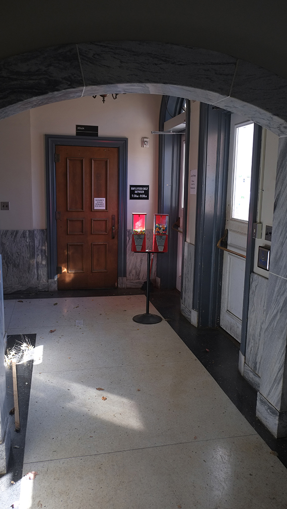 Leaving the boy’s bathroom, I entered the girl’s bathroom and discovered the only difference was a lack of a tv, stall dividers, and a corncob keeping the window closed. Why? Just why? I mean, did someone actually eat in here? Shaking off the gross mental issue of eating in this dark, dank, and yes smelly place, I made myself down the near black hallway. It wasnt a very long hallway at that and I had to ask myself “Just how many kids went to this school”? There just wasnt that much to the place.