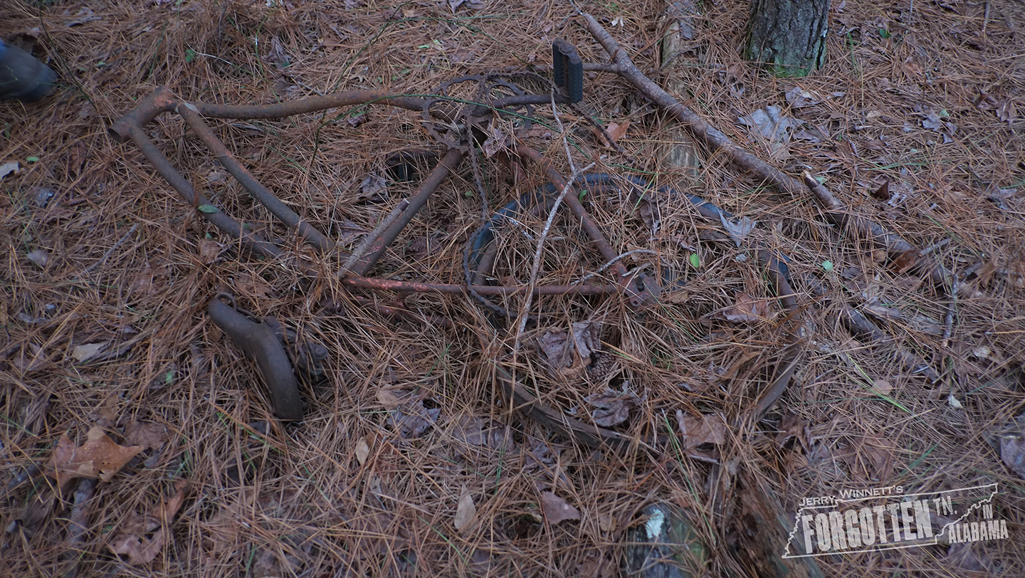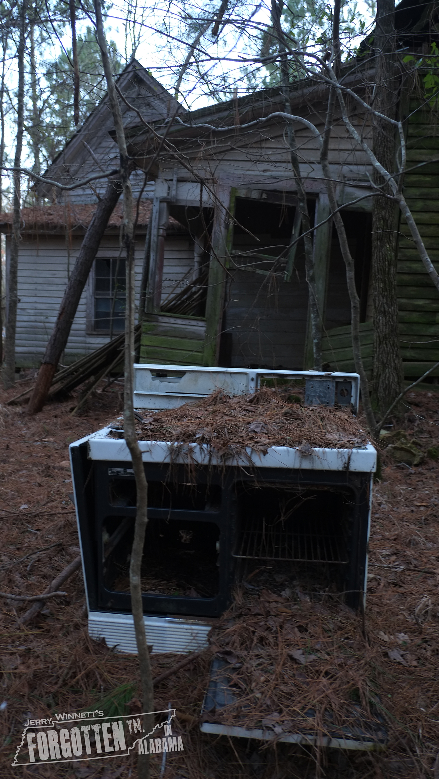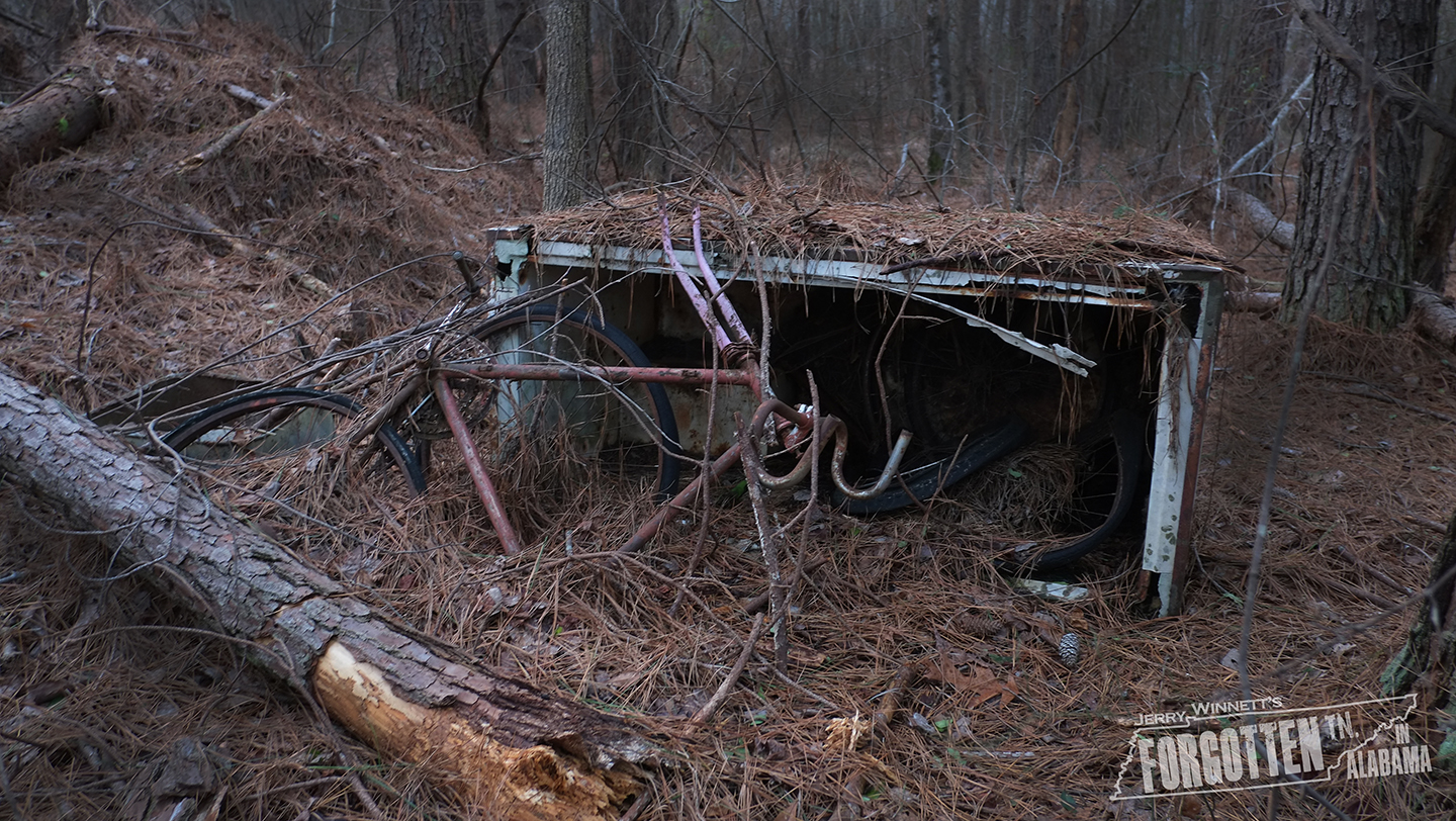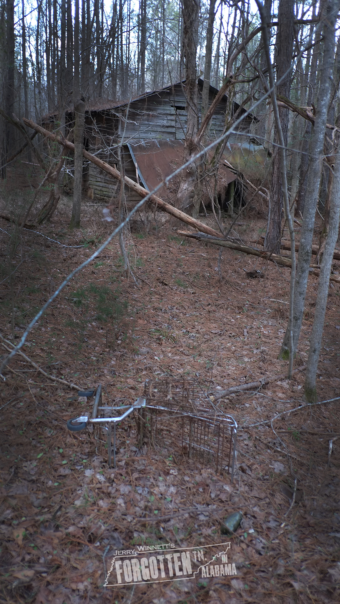 Keep in mind we were at least 15 miles from Vernon, AL. We were miles from any store we’d seen. But here in the woods just a stones throw from the house was a grocery cart. I’d love to know if at some point there was a store nearby.