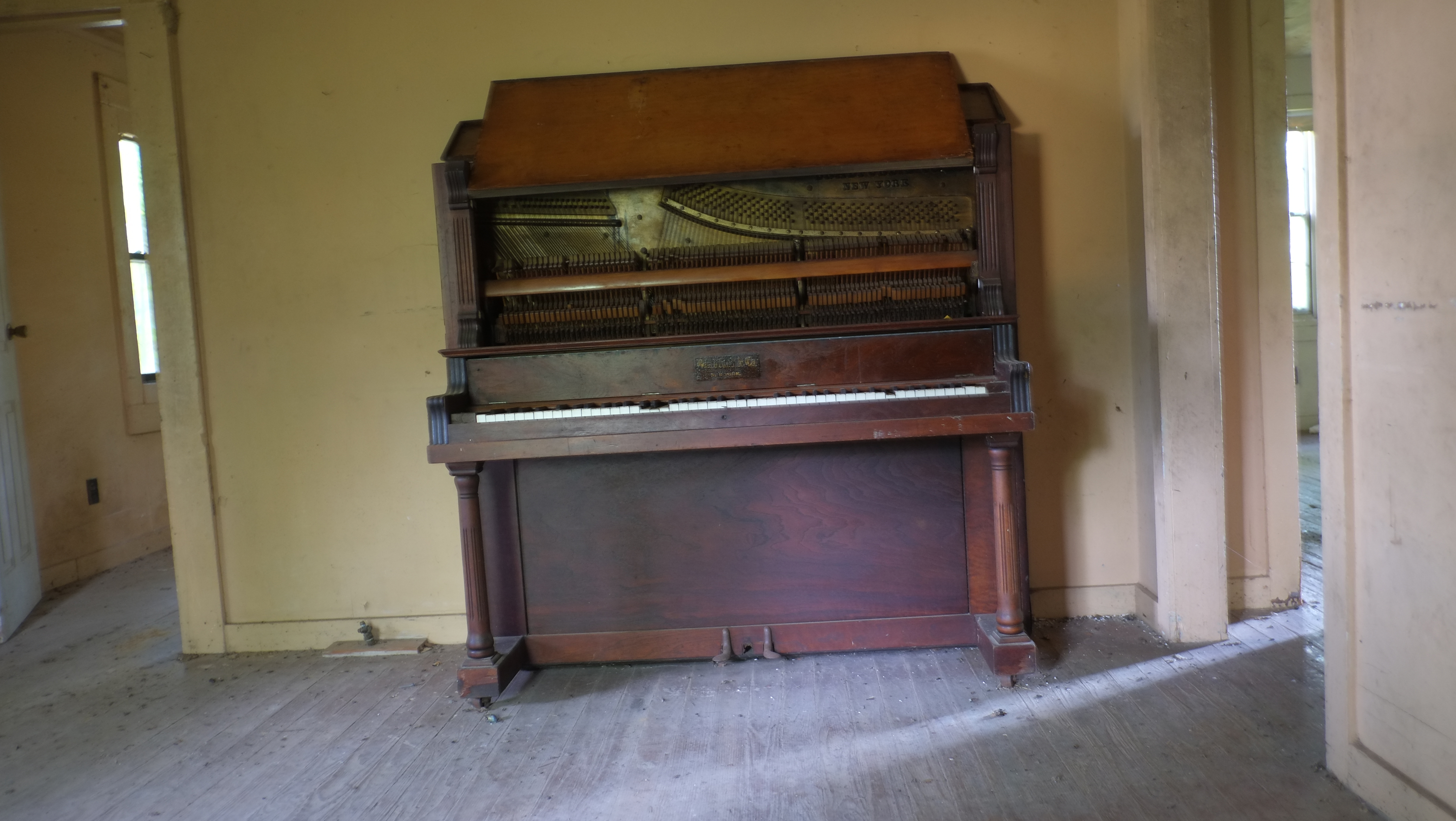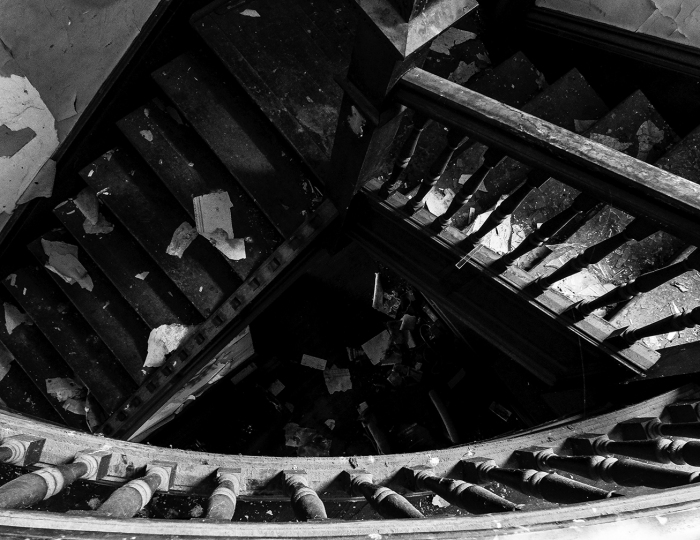 Under the collapsing roof and over the sketchy looking porch we went and found ourselves in a hallway that was nearly black. We were in luck, we still had at least an hour or so of daylight to explore. Without that daylight we’d been in trouble. The house’s floors were nearly rotted out, in one room the floor was caving in while in another it was bowing upwards even while it’s ceiling was canted down.