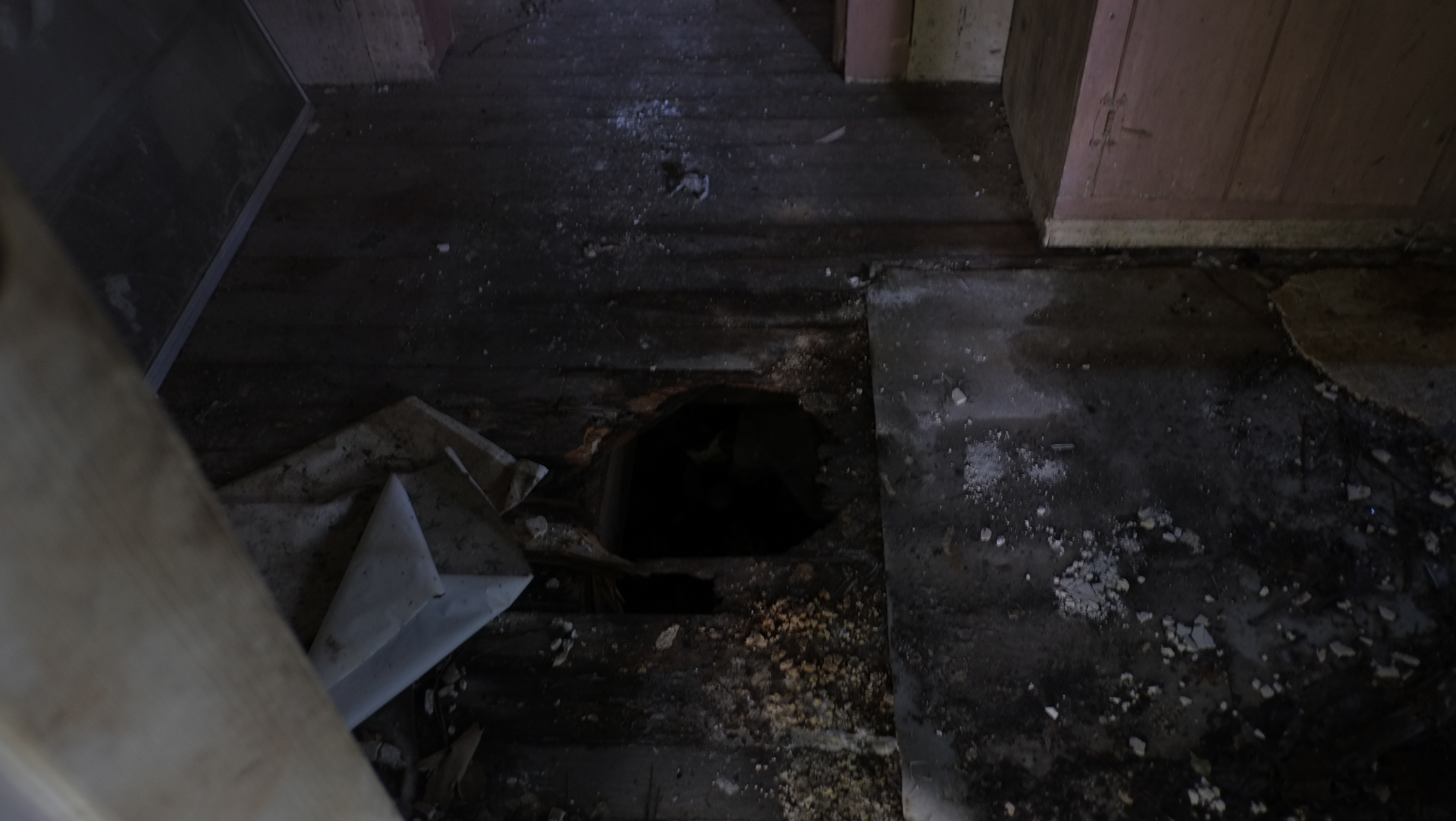 One open closet on the left revealed a floor that was severly damaged and showed a short drop to the ground below, while above were the broken and rotted risers of the stairwell to the 2nd floor where the inkeeper had an apartment.