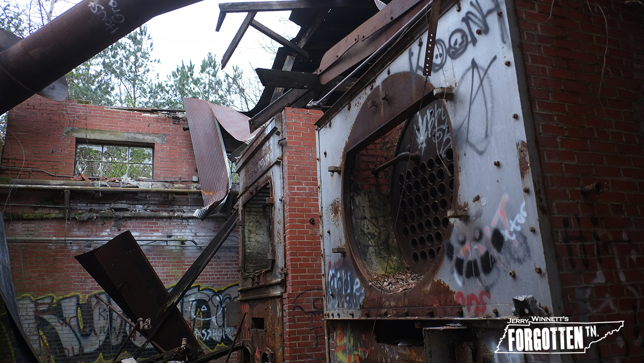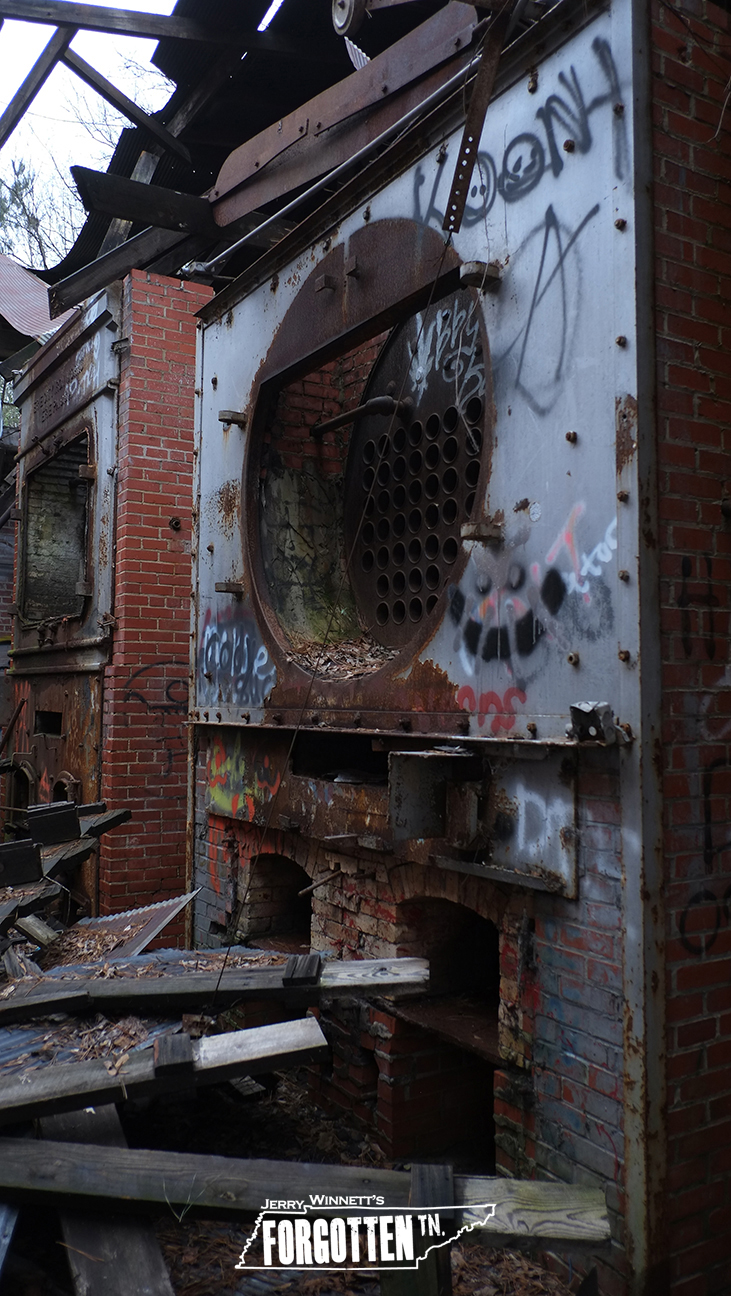 The first thing we noticed about the second building was an iron smoke stack that had collapsed upon it caving in the roof. Inside stood something I’ve always wanted to photograph, giant furnaces. Two massive twelve foot furnaces dominated the interior. The two of us wandered the building and discovered it was every bit as dark and creepy as the main building itself. Here and there I could see where doors had been nailed shut from the inside, Why? On the back of the brick and iron furnaces were small tunnels that may have been for loading in coal or for digging out ashes. In another room were two equally giant boilers, and leaning over it all was the top of the iron smoke stack that had destroyed the tin roof.